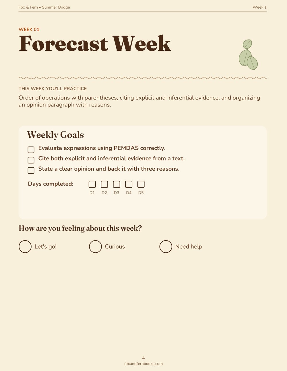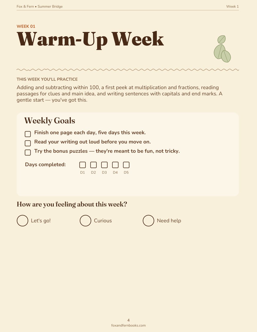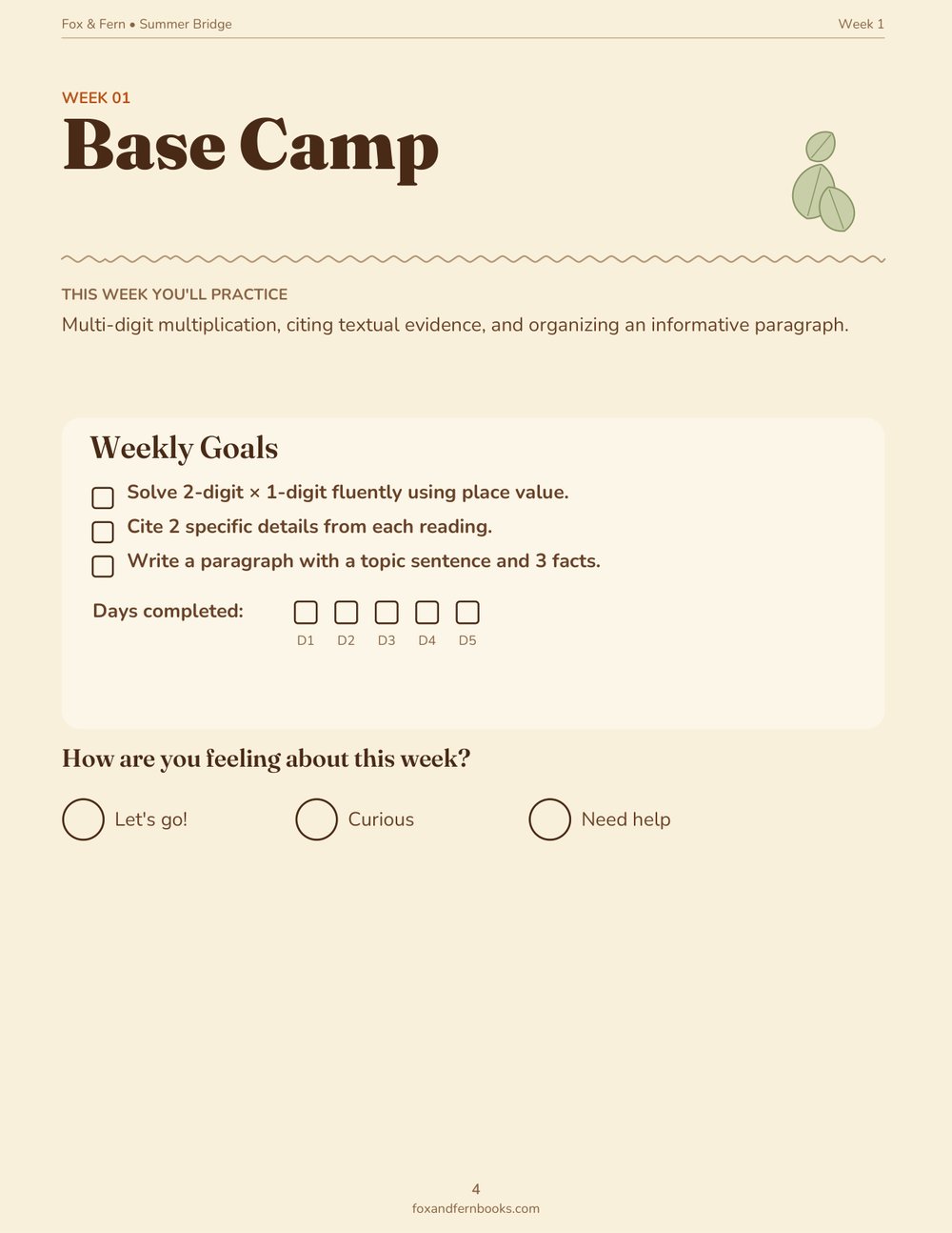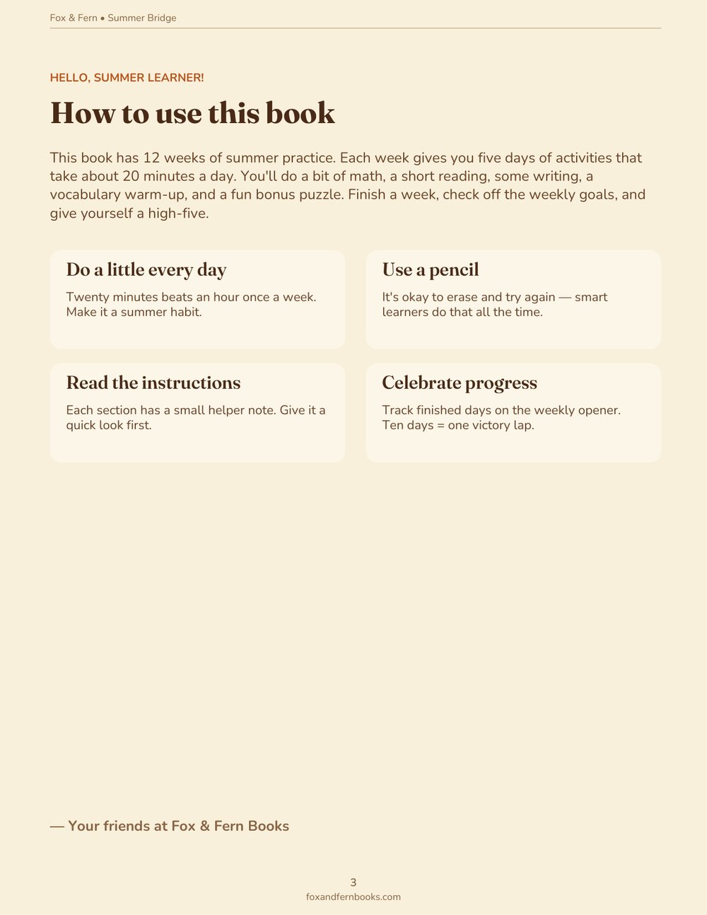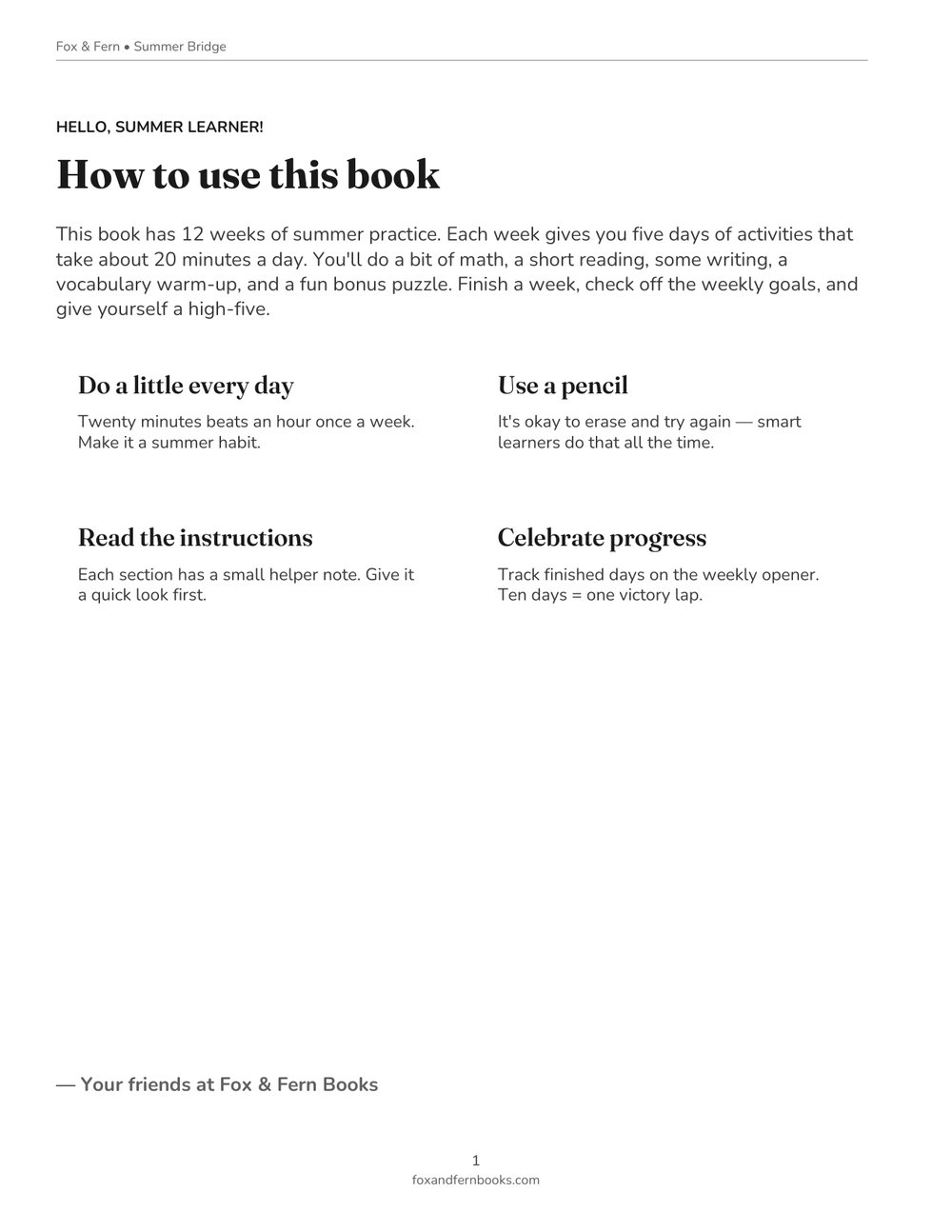 Summer Bridge Activity Workbooks bridge the summer slide with 12 weeks of short, confidence-building daily practice. Each grade-band workbook blends math, reading, writing, and fun activities in a kid-friendly rhythm that fits real summers. Warm, uncluttered pages that treat kids like capable learners — and summers like summer.